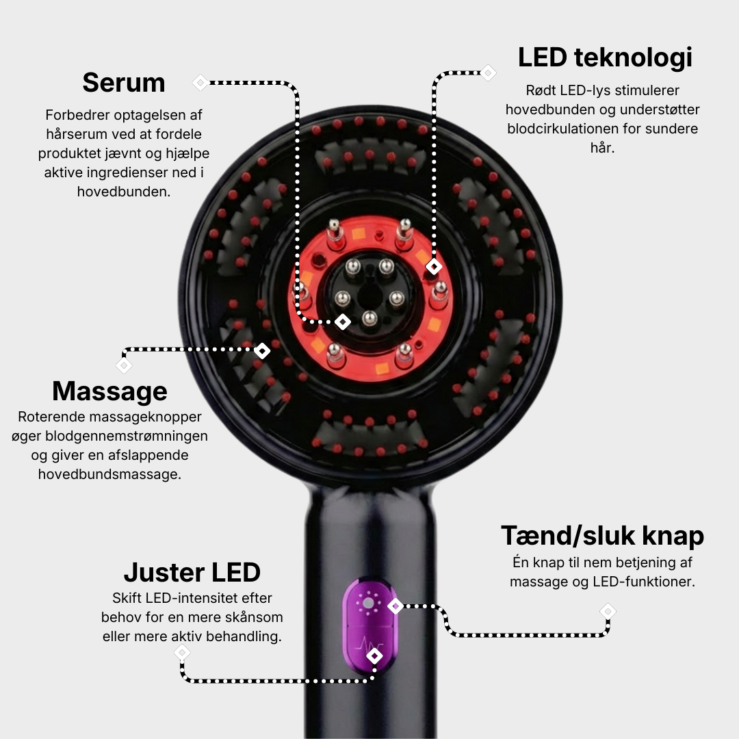 Den er designet til at stimulere hovedbunden, reducere hårtab og fremme hårvækst, hvilket gør den effektiv for alle, der ønsker sundere og fyldigere hår.