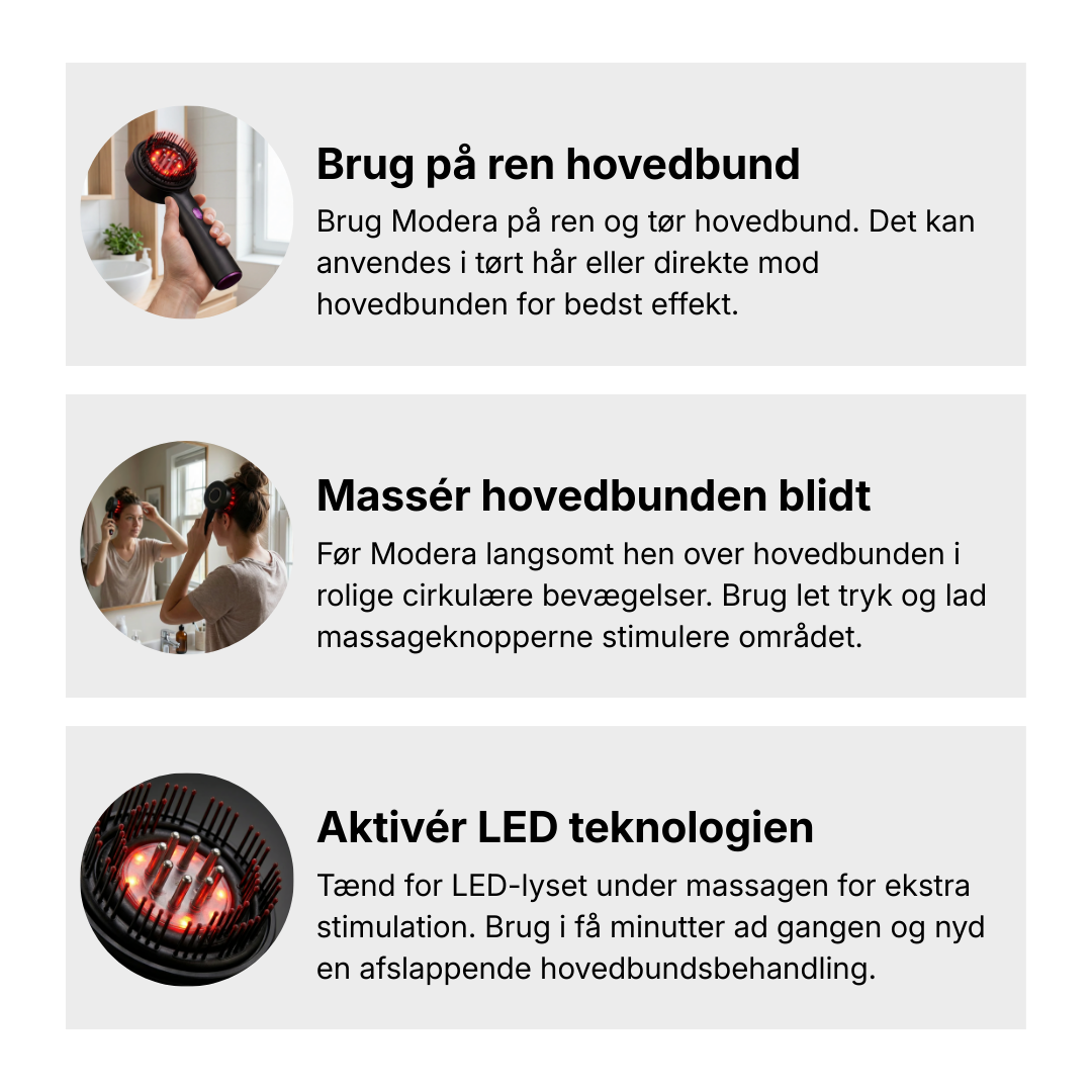 - Serumet fordeles effektivt, og den røde LED-teknologi hjælper med at forbedre blodcirkulationen og stimulere hårsækkene.